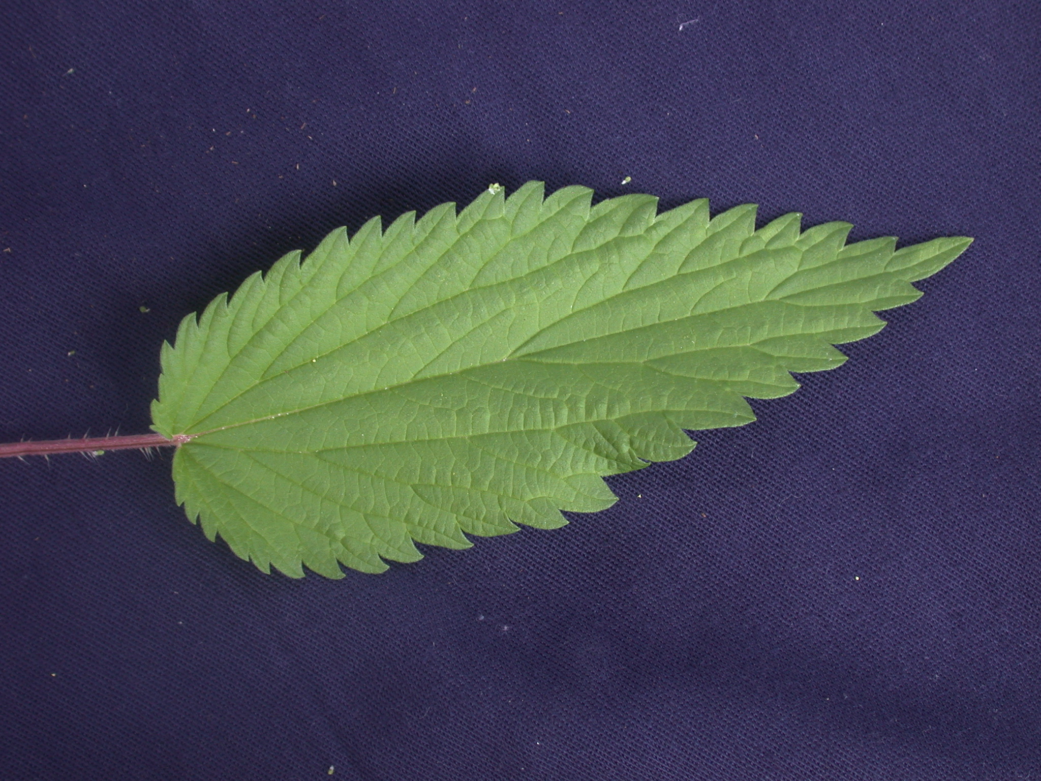 The thin, bright to dark green leaves are opposite, with saw-toothed margins and infamous stinging hairs on the underside. Leaves are broadly to narrowly egg-shaped (2 to 6 inches long, 1 to 2 inches wide), with a rounded or heart-shaped base and a pointed tip. Aside from the stinging hairs, the upper and lower leaf surfaces are usually smooth (the lower surface may be slightly hairy). Pointed stipules (small leaf-like appendages) occur at the base of the leaf, but senesce early. Leaf stalks are 1/4 to 2/3 the length of the leaf.